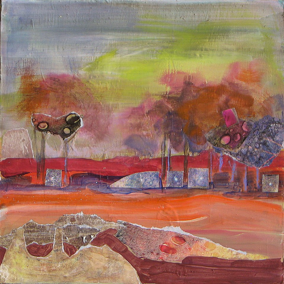 Apple Trees, mixed media on board, 10 x 10 in